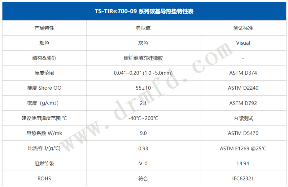 TIR”700-09系列产品可模切成不同形状提供。如需不同厚度请与本公司联系。如需更大尺寸,请与本公司联系。 欲了解更多导热材料的产品信息,请与本公司联系。www.drmfd.com